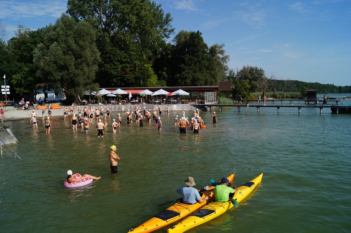 Es hat geklappt. Die August-Sonne hat den See innerhalb von 4 Tagen wieder auf 20 Grad erwärmt. Das ist zwar noch nicht Badewassertemperatur, aber warm genug für die 68 Schwimmerinnen und Schwimmer, die sich bei strahlendem Sonnenschein um Punkt 10 Uhr ins Wasser stürzen und losschwimmen, immer die kleine weiße Fahne am Bootssteg in Buch im Visier. Begleitet wird das Feld der Aktiven von etlichen Ruder- und Tretbooten sowie den Booten und einigen SUPs der Wasserwachten Schondorf und Buch.
