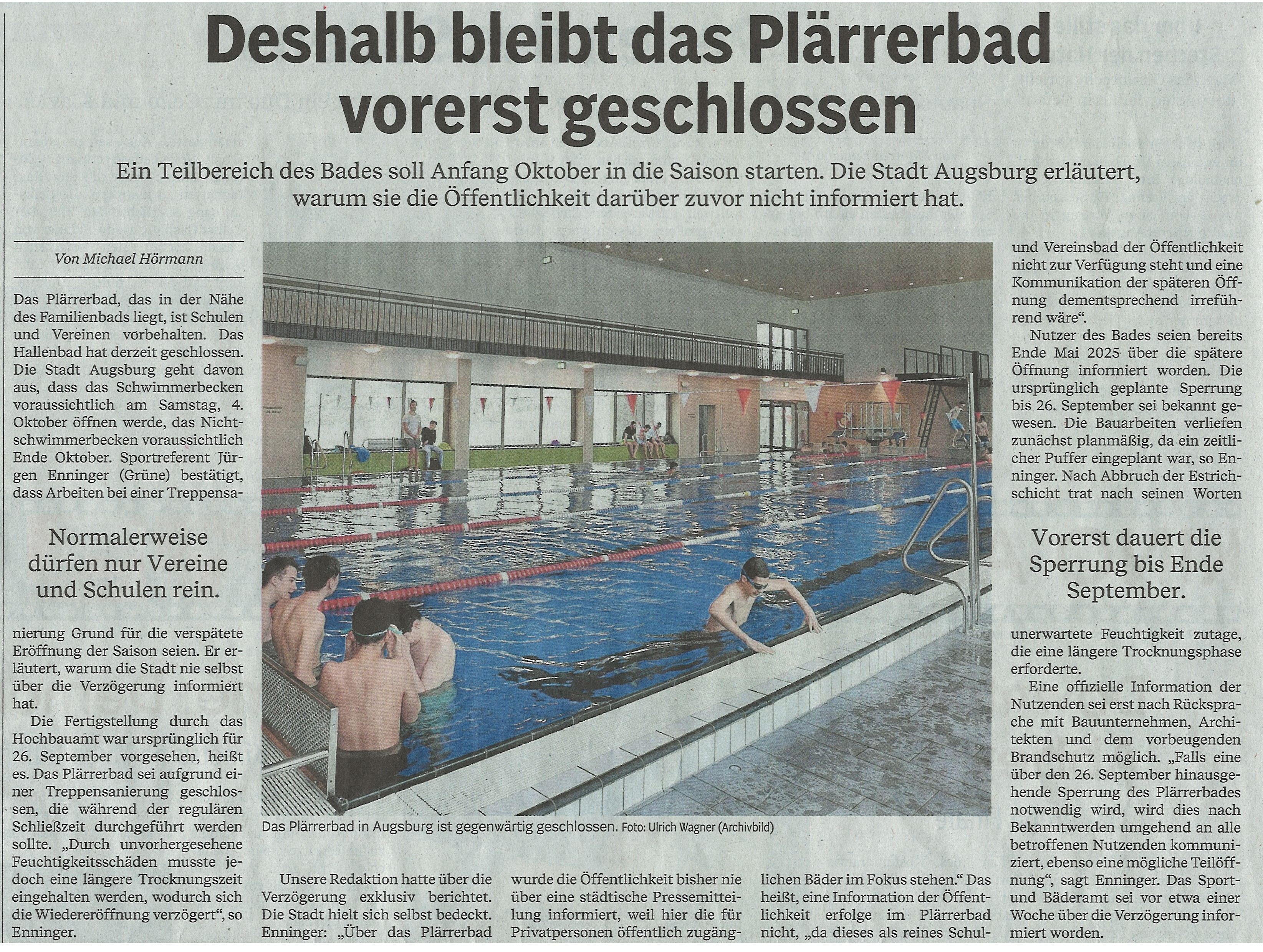 Stadt Augsburg - Schließung des Plärrerbades führt zu erheblichen Einschränkungen für die Augsburger Schwimmer
